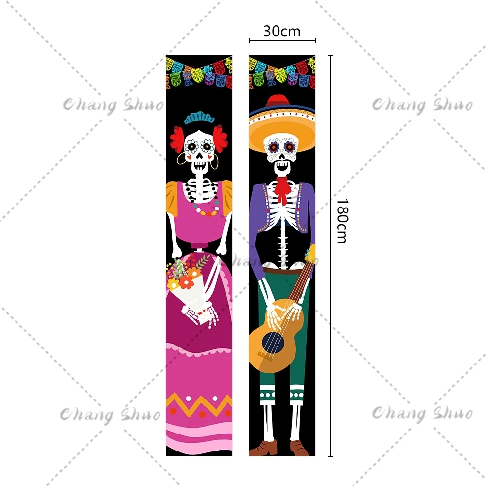 FRIENDLY HALLOWEEN OUTDOOR DECORATIONS: The Dia De Muertos door sign measures about 30 x 180 cm/ 12" x 72.4" . Hanging Mexican fiesta banners to your front porch and add the holiday fun for your family and guest. Great for decorating doorways halls to enhance the Days of the Dead party atmosphere